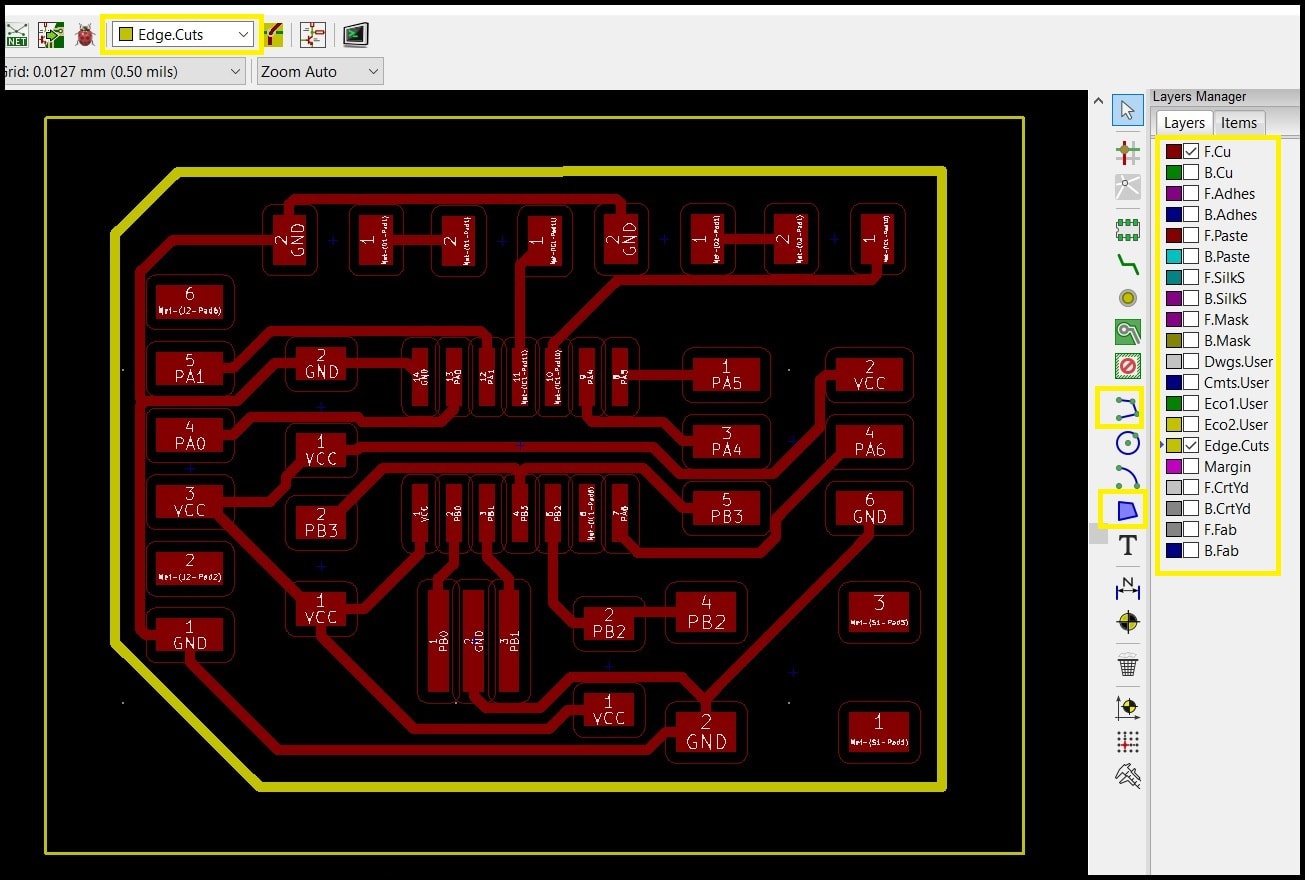 Step 8: Go to “Edge.Cuts” layer and using “Add graphic lines” tool, draw the cut lines for your board. Using “Add graphic polygon” tool, draw a polygon around the board. Start at the first corner and draw a polygon and end drawing by double click where you started.