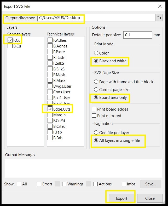 Step 9: Now we will export the board as SVG file. Go to “File > Export > SVG…” and use the settings below.