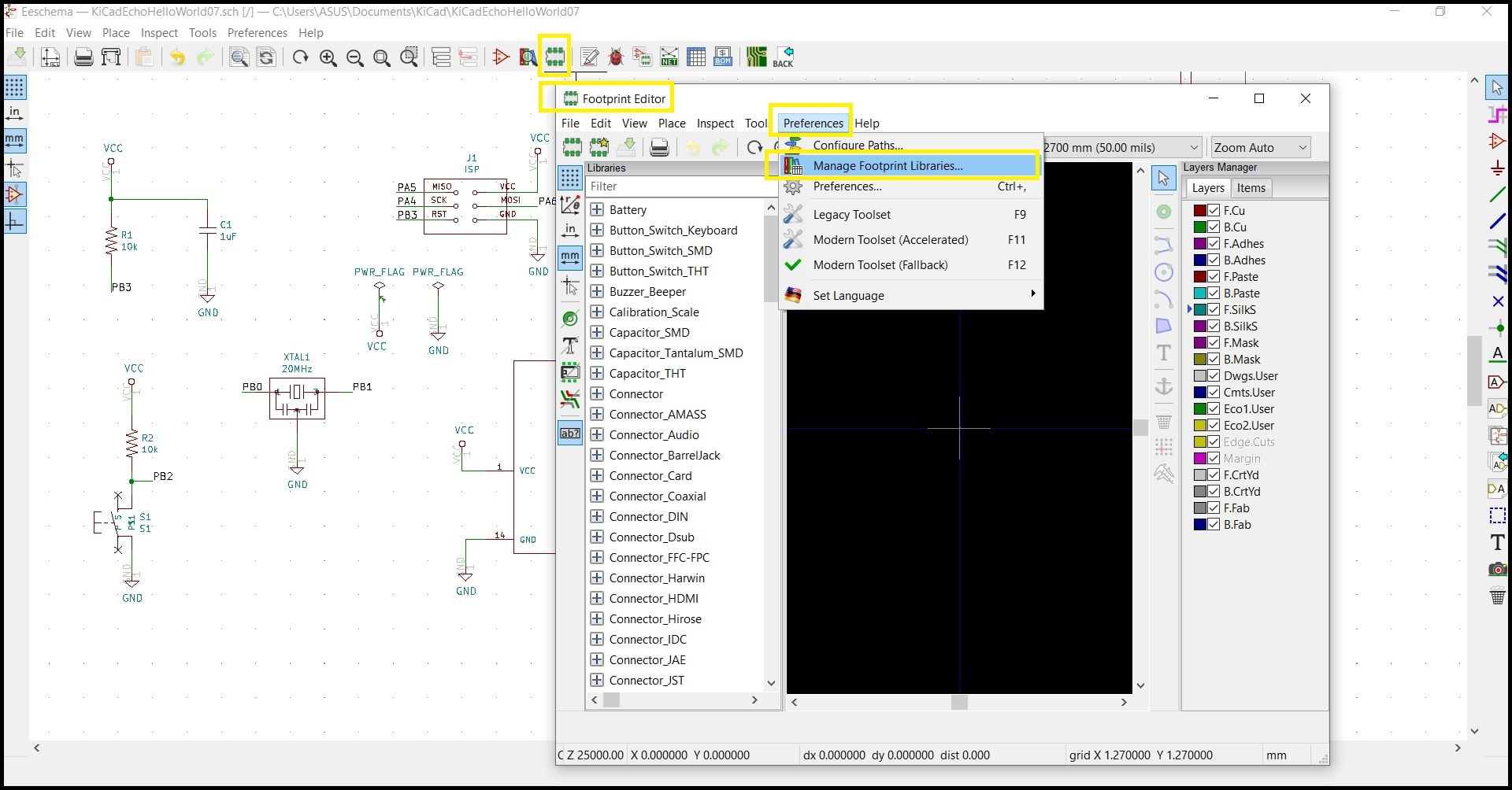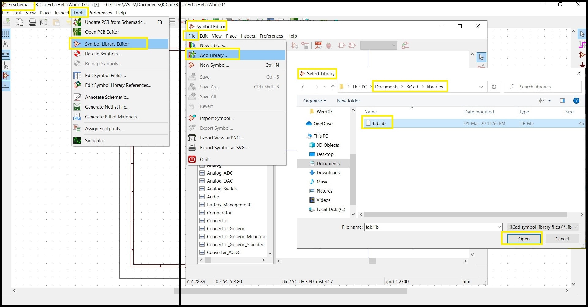 Step 1: Before we continue to PCB, we need to update the footprint for components in fab.lib. Footprints define the package of components used in PCB.