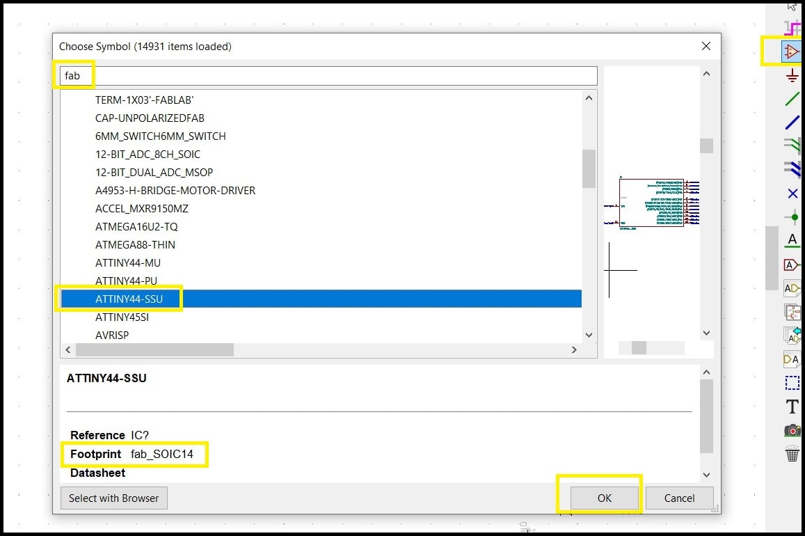 Step 4: Now we will add the components for the original echo hello-world ATtiny44 board. Click on “Place Symbol” and click any place in the work area. This will open “Choose Symbol” window. In “Filter” field type “fab”. Scroll down and click on “ATTINY44-SSU” and click “Ok”. Place the component any place in the work area. Repeat for all items in the table.