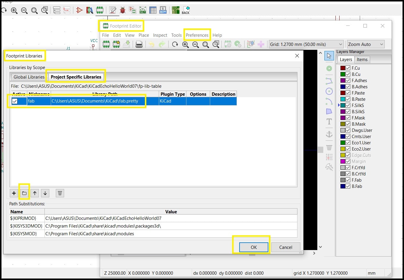 Step 2: In “Footprint Libraries” select “Project Specific Libraries” if you only want to add the footprints libraries to this project. Click on “Add existing library to table” and locate your fab.pretty folder. Click “OK” and then “OK” for footprint libraries. Close the footprint editor.