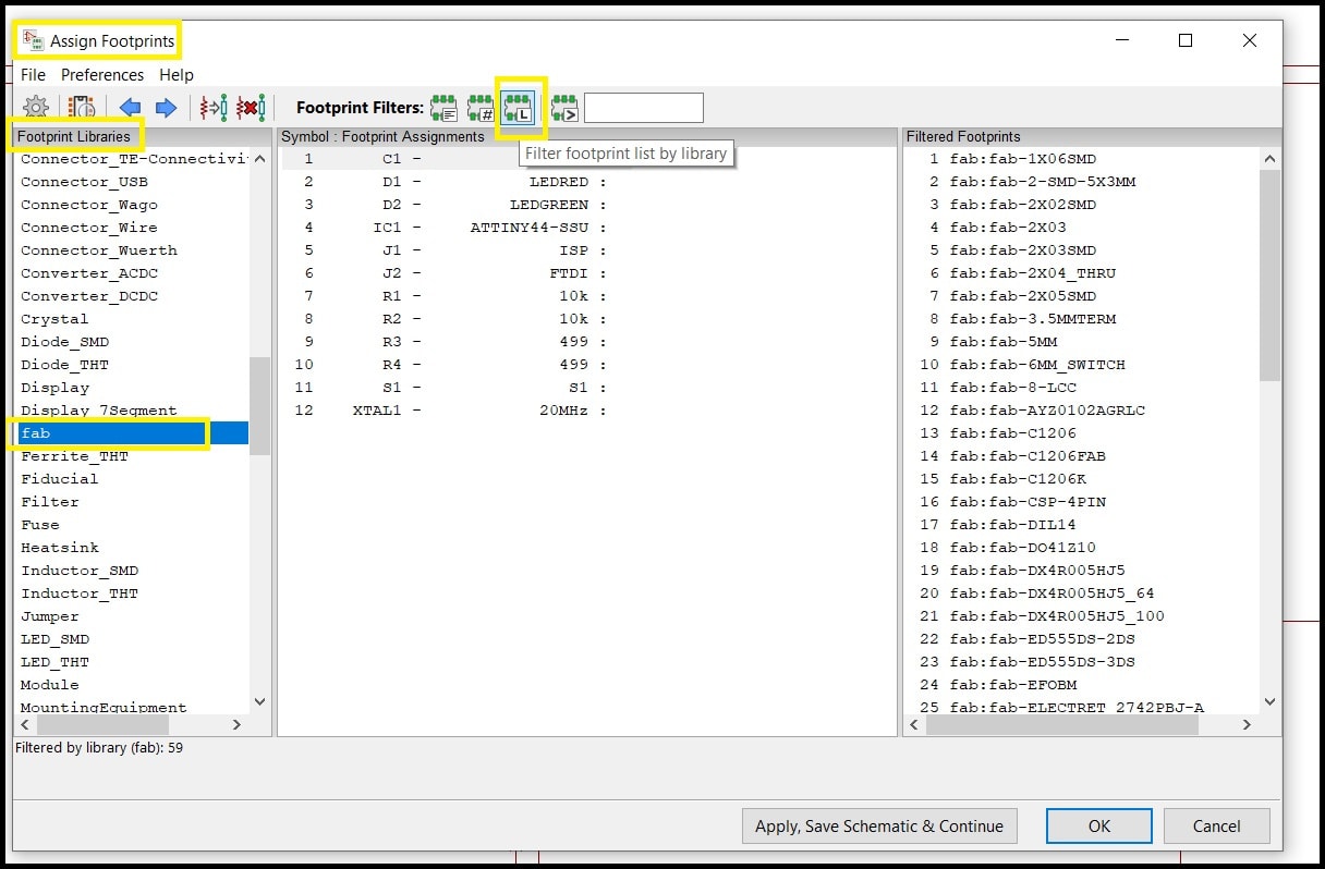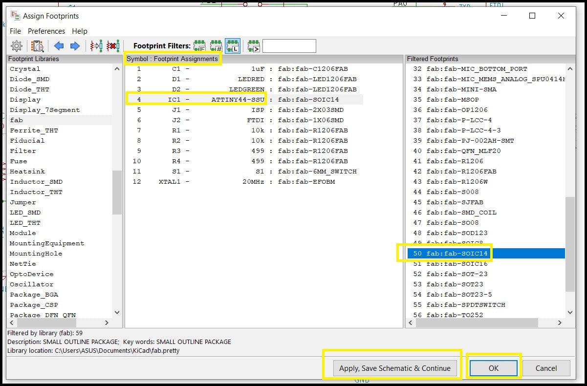 Select the “ATTINY44-SSU” from the “Symbol: Footprint Assignments” tab, and then double click “fab-SOIC14” from “Filtered Footprints” tab. Now the fab-SOIC14 footprint is assigned to ATtiny44. Repeat for all components. Click on “Apply, Save Schematic & Continue” and the click on “Ok”.