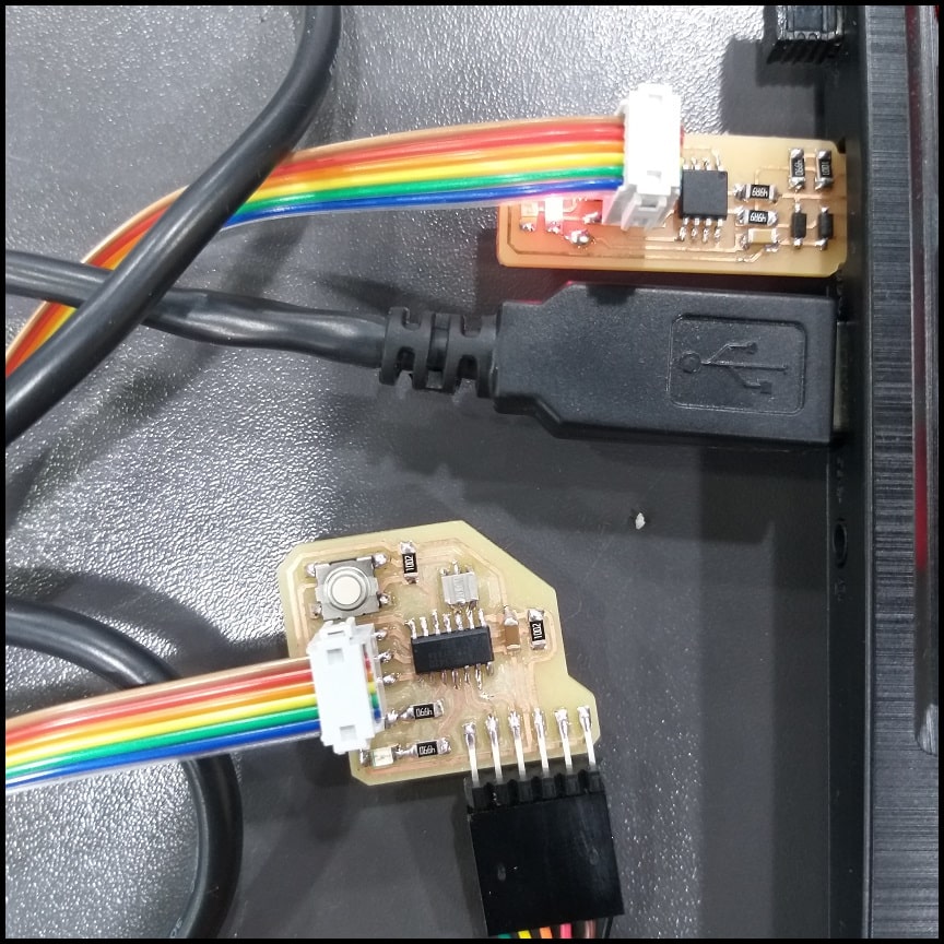 Step 2: Connect the board to FabTiny programmer through the SPI cable. Connect the FTDI cable to the board through FTDI header. Make sure that you connect cables in the right direction such that the board, SPI cable and FTDI cable have the same GND. Connect the programmer and the FTDI cable to USB ports.
