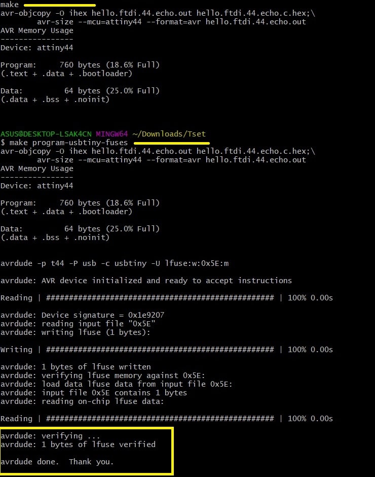 Step 4: In git bash window, execute “make program-usbtiny-fuses”. This will program the ATtiny44 fuses.