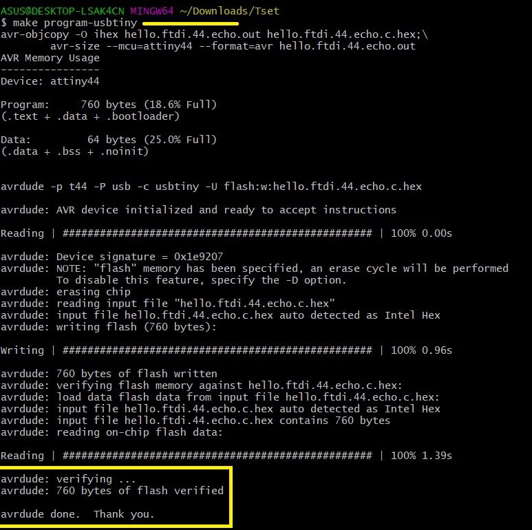 Step 5: In git bash window, execute “make program-usbtiny”. This will upload the HEX to ATtiny44.