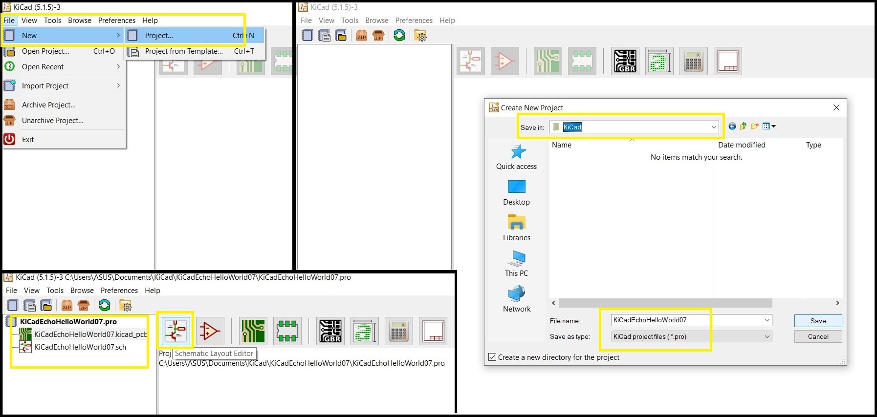 Step 1: Open KiCad software. Go to “File > New > Project”. Select the location and give your project a name. Click “Save”. I named mine “KiCadEchoHelloWorld07”. This will be the container for the schematic and PCB.