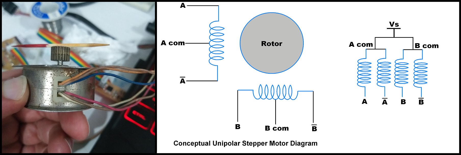 I looked for a datasheet for the stepper (I got it from an old printer) but couldn’t find any. I made some tests mapped the wires as shown below.