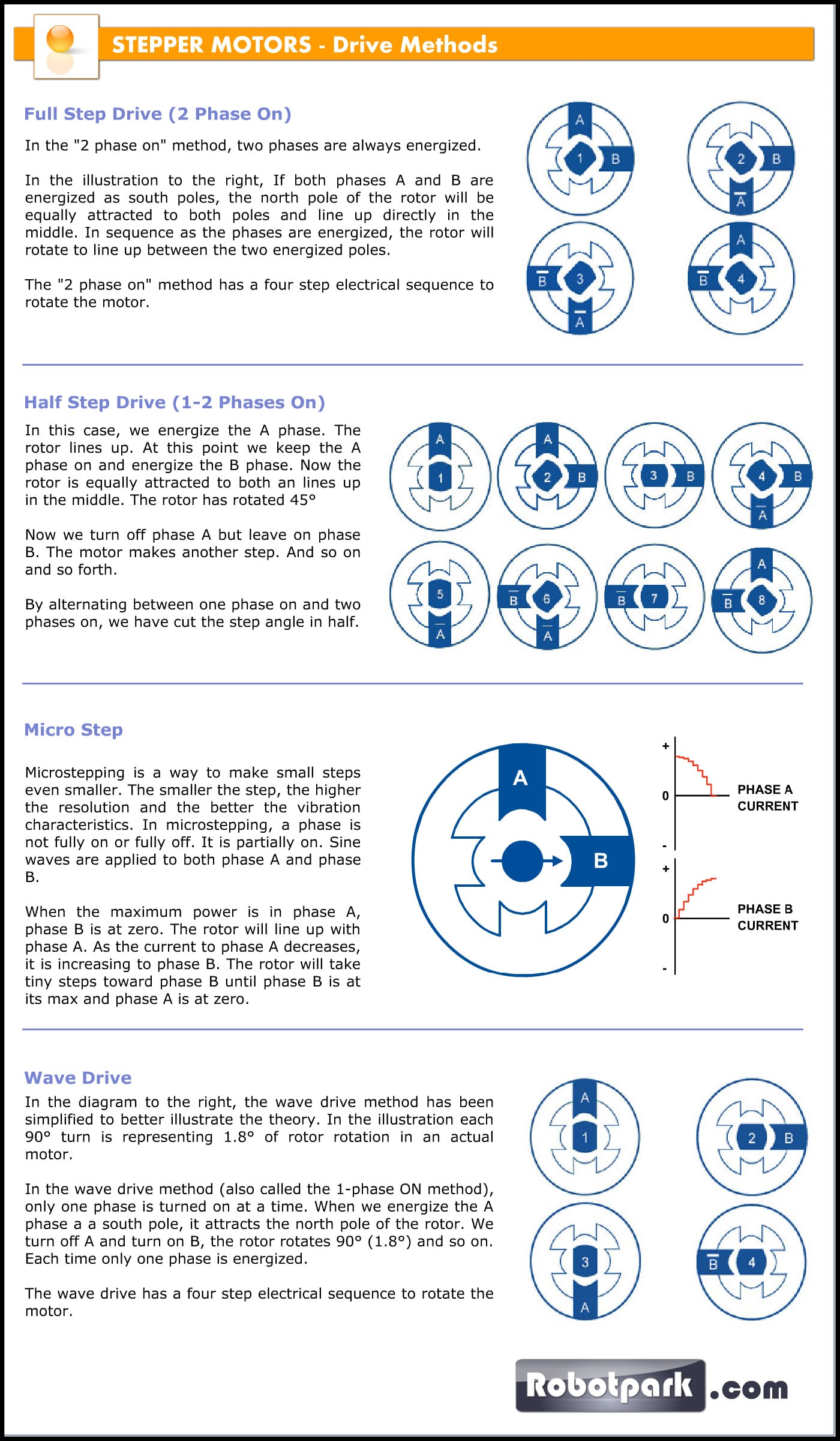 The motor can be driven in wave drive (single coil excitation), full step drive (double coils excitation), half stepping and micro stepping.