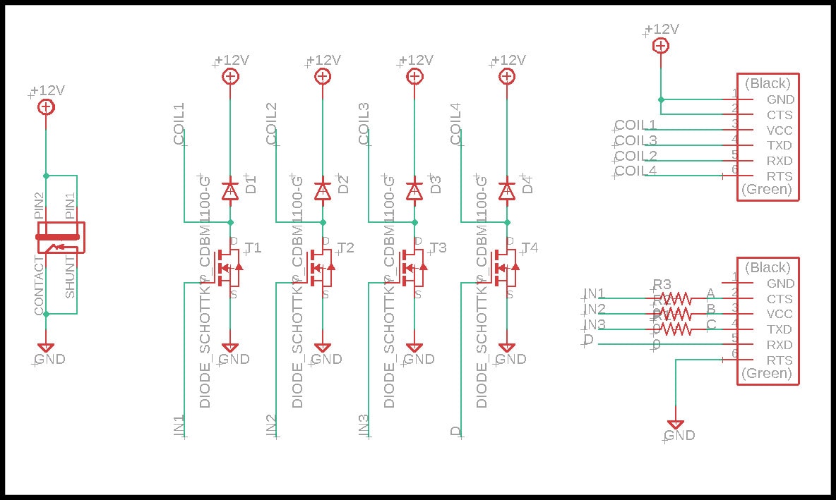 Note that I added 4 flyback diodes parallel to stepper windings and in reverse direction. “A flyback diode is a diode connected across an inductor used to eliminate flyback, which is the sudden voltage spike seen across an inductive load when its supply current is suddenly reduced or interrupted” Source