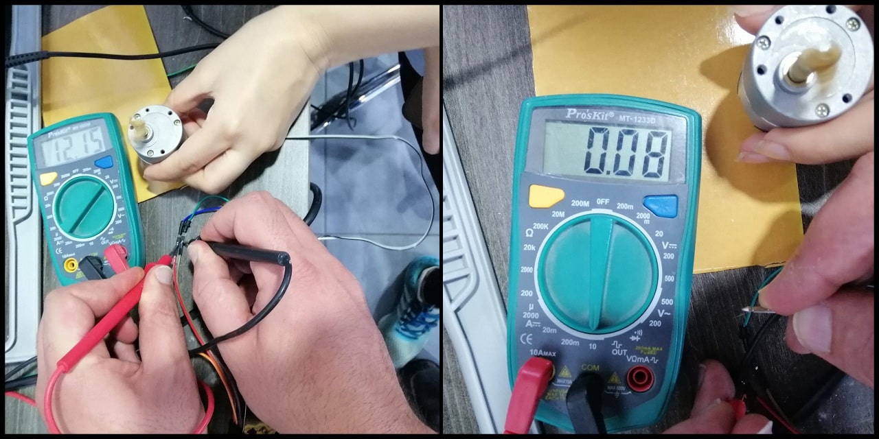 In this part we measured the power consumption of a DC motor using a DC motor output board. Power (in Watt) is calculated by P = V x I, where V is the voltage across the load and I is the current passing through the load. To measure voltage, the digital multimeter (DMM) is connected in parallel with the load, and to measure the current passing through, the DMM is connected in series with the load. Remember to move DMM positive test lead to current measuring position before connecting in series with the load.