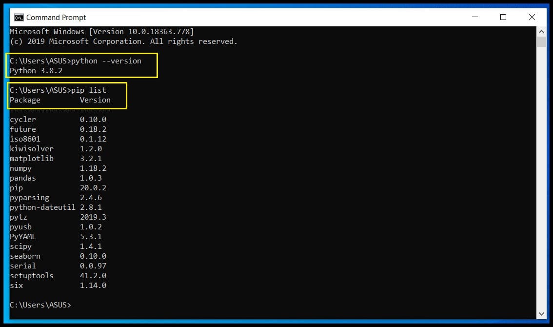 Step1: Go to Python page and install python to your PC. I am using Python 3.8.2 under Windows. After completing check Python version using Windows Command Prompt using the command “python –version”. To check what packages are installed to your Python, type “pip list”.