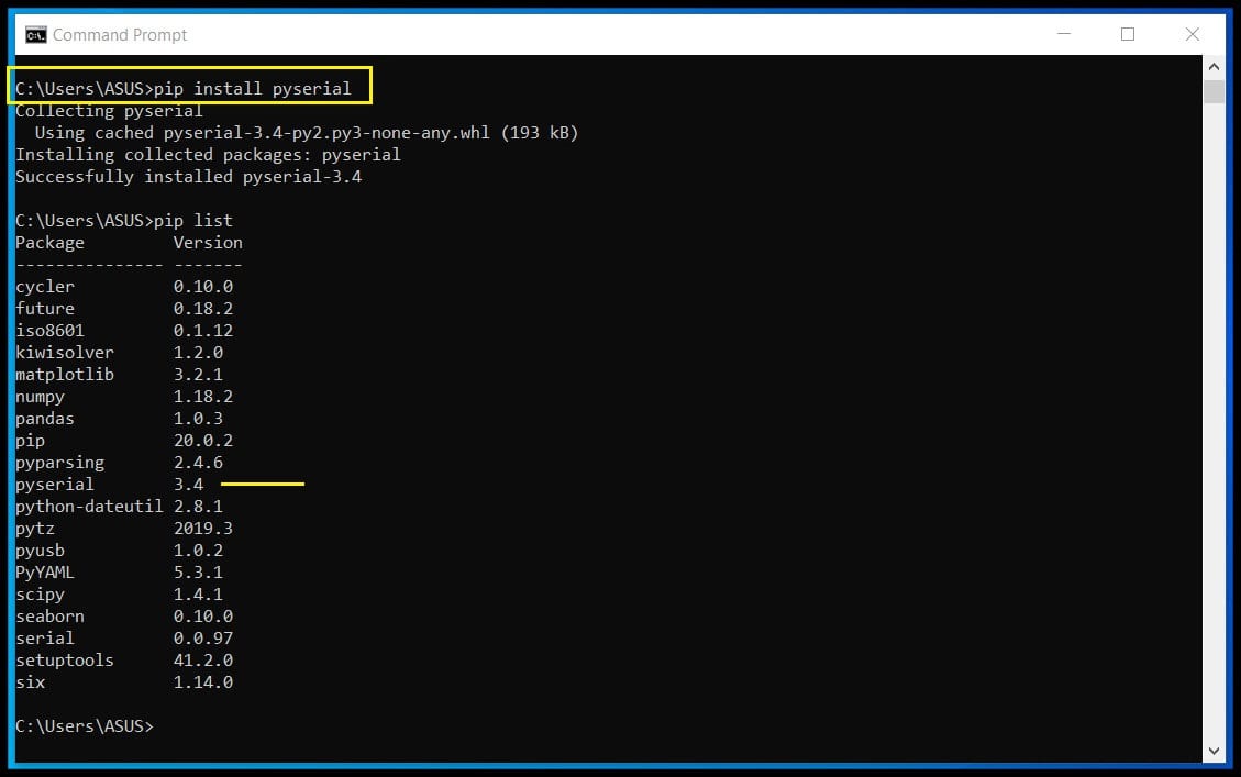 Step2: The list shows that pyserial is not installed to Python. Type “pip install pyserial” to istall the package. Now pyserial 3.4 package is installed.
