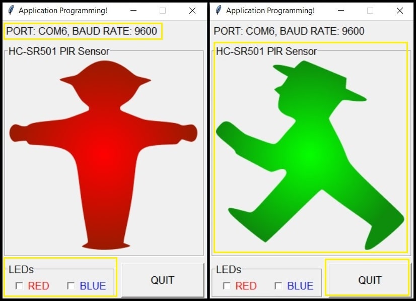 5. Canvas widget: Used to display the PIR status. If motion detected a green walking man will be shown, otherwise a red still man will be shown. The canvas is contained in a labeled frame (HC-SR501 PIR Sensor). The code below creates “PIRCanvas” as instance of type tk.Canvas and its parent is “PIRFrame”. The “PIRFrame” is instance of type tk.LabelFrame and its parent is “root”. Images to be displayed in the canvas are loaded from the hard drive and they are saved in the same folder where the code exists.