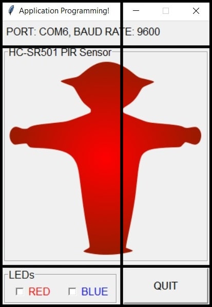 The serial communication happens in “Communicate” function. Inside, the function reads the value of LEDs check buttons and send (using ser.write) to the ATtiny44 Development Board, and reads (using ser.read) the PIR sensor value from board. The byte to be sent using ser.write should be of type “bytes”, this is done by casting the variable “leds” into type bytes by the line of code “leds = bytes([leds])”.