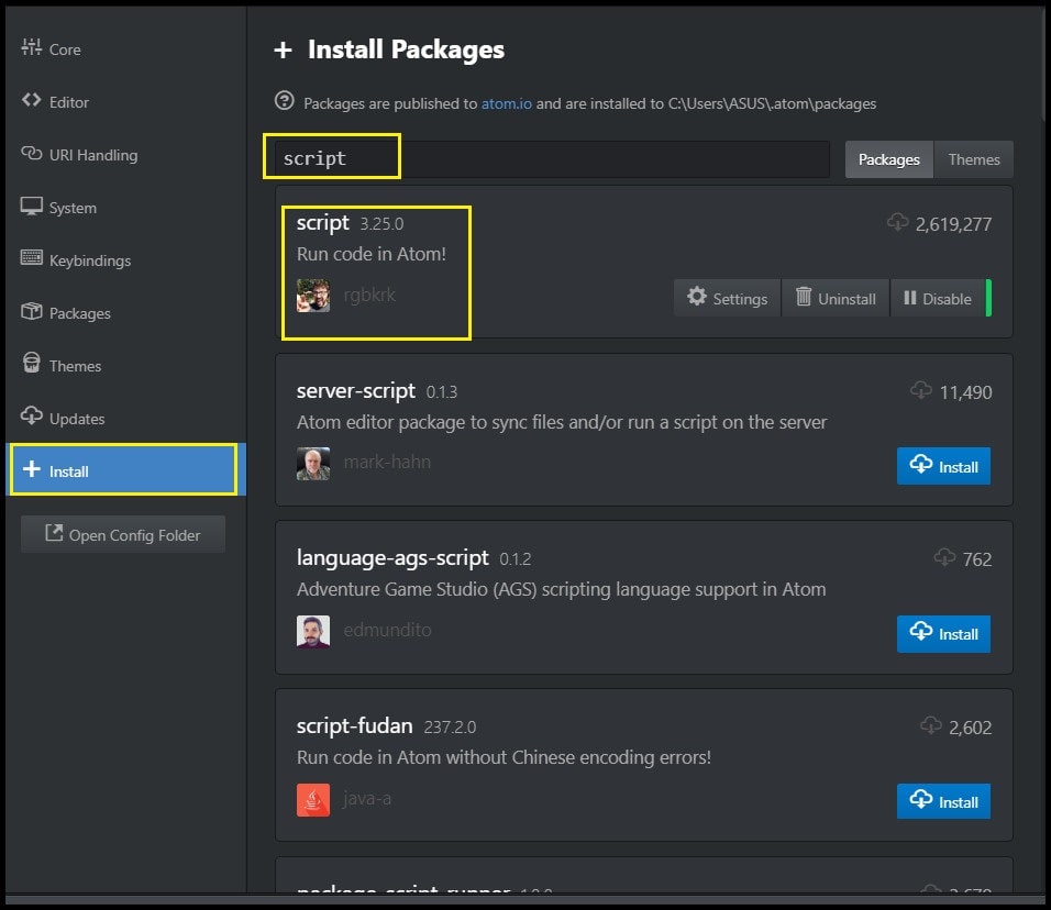Step 1: Install and open Atom. Go to “File > Setting > Install”. In search package field, type “script”.
