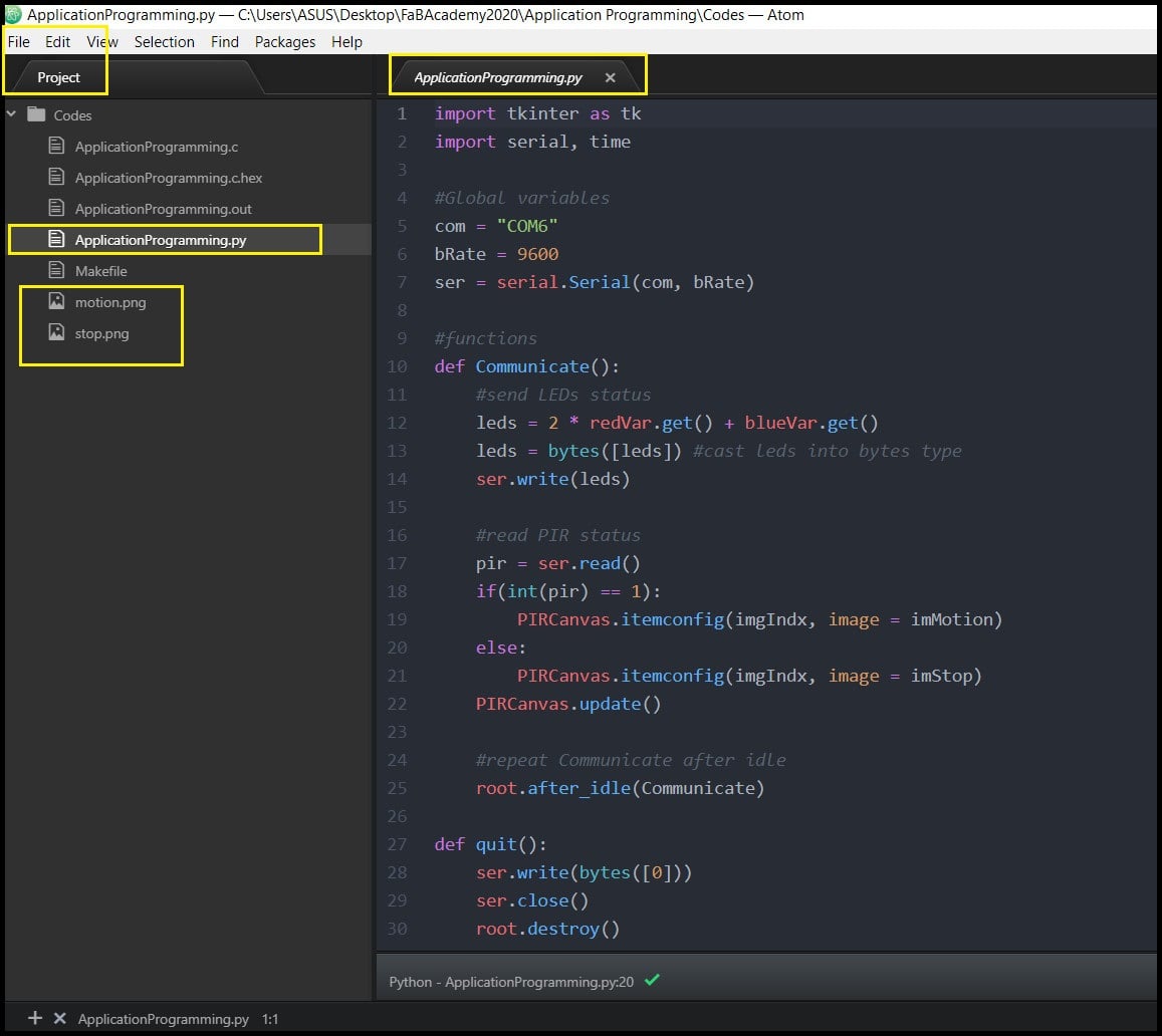 Start Atom and go to “File > Open Folder” and select the folder where the Python code and images exist. A project tab will open to the left. Click on your Python file to open it.