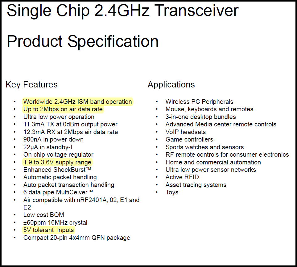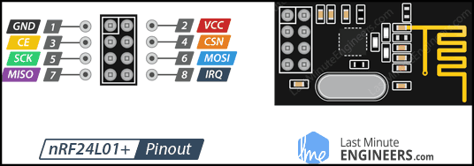 The NRF24L01+ is a 2-way (transceiver) communication module. It could be used to connect two or more boards wirelessly over a distance. It is designed to work on 2.4GHz ISM frequency, and data transfer can be one of 250kbps, 1Mbps and 2Mbps.