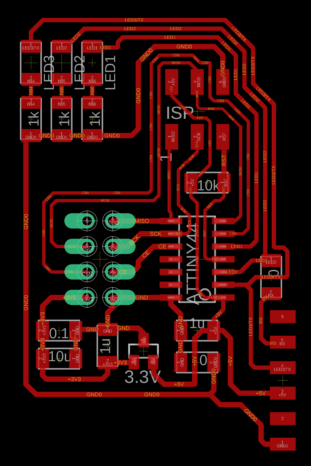 In this week I worked on the NRF24L01+ 2.4GHz Transceiver module. I designed a PCB with three LEDs. I will mill and solder two of that PCB, the first will be working as transmitter and the other as a receiver. Since NRF24L01+ 2.4GHz is a “transceiver”, each board can work as a transmitter or/and a receiver. This is controlled by code.