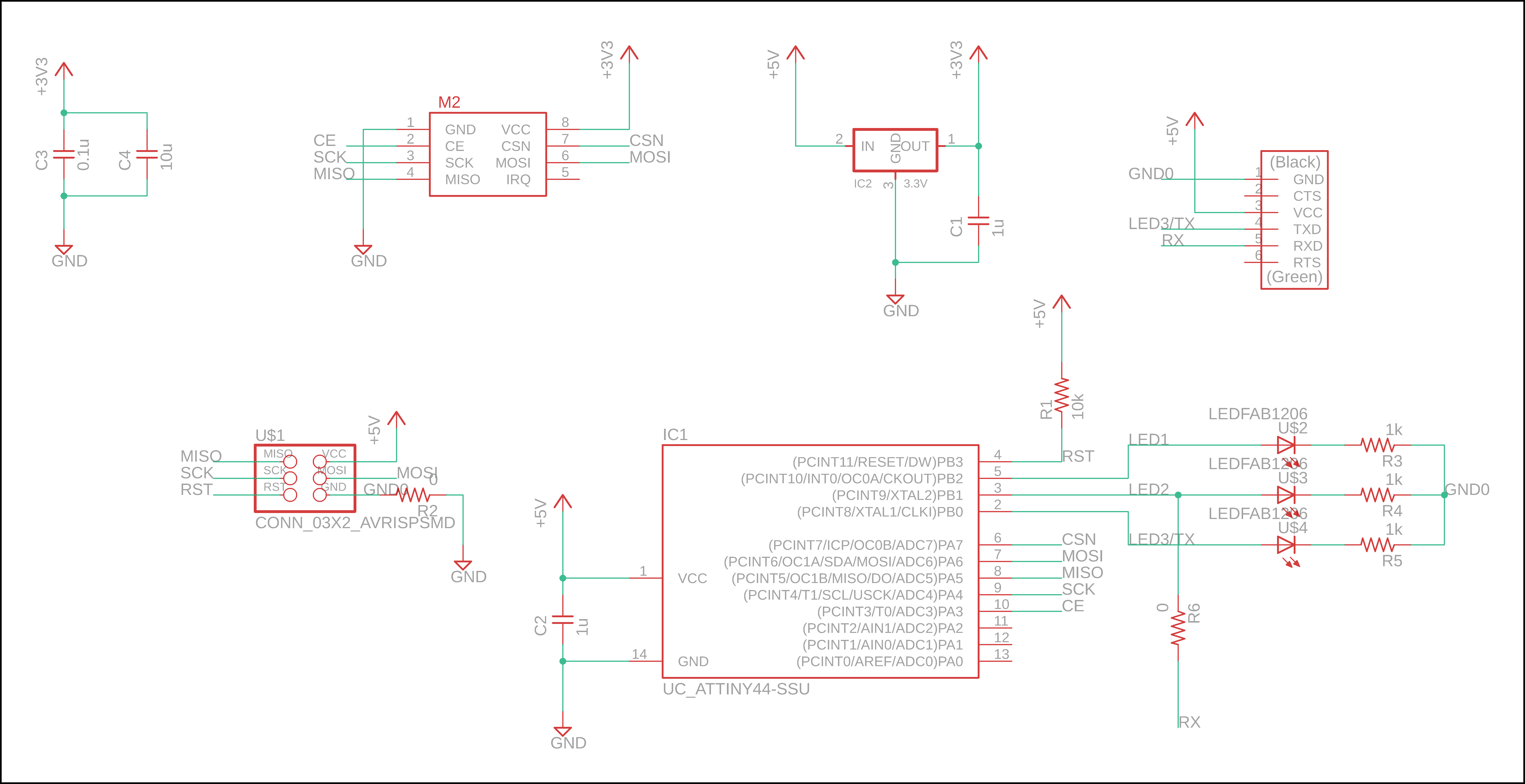 The PCB is based on ATtiny44 and it could be configured to work as a transmitter or a receiver. The pin IRQ is not connected since I am not using interrupts. Three LEDs are added to the board and also FTDI connector.