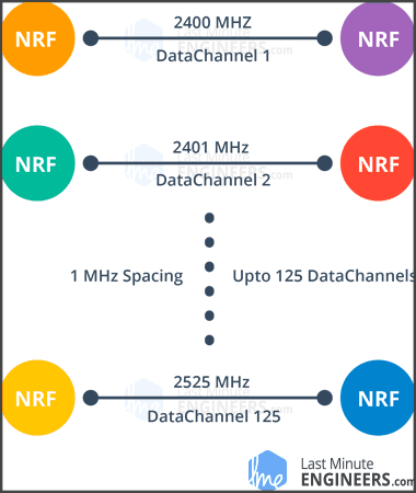 In order for two NRF24L01+ modules to communicate, they should be on the same channel (frequency). “This channel could be any frequency in the 2.4 GHz ISM band or to be more precise, it could be between 2.400 to 2.525 GHz (2400 to 2525 MHz). Each channel occupies a bandwidth of less than 1MHz. This gives us 125 possible channels with 1MHz spacing. So, the module can use 125 different channels which give a possibility to have a network of 125 independently working modems in one place.” Source This is true if 250kbps or 1Mbps data rate are used. If 2Mbps is used, then 2MHhz bandwidth is occupied.