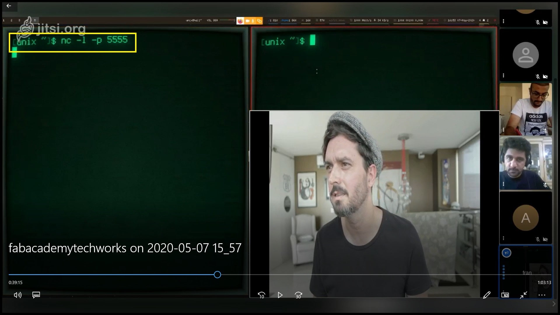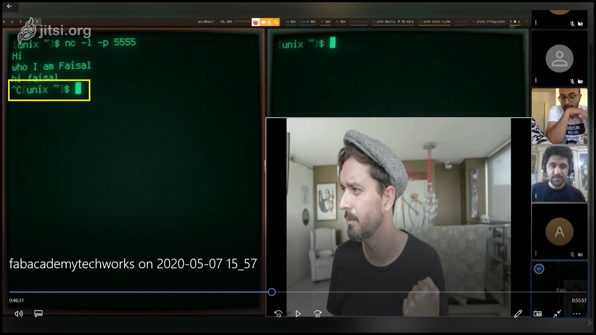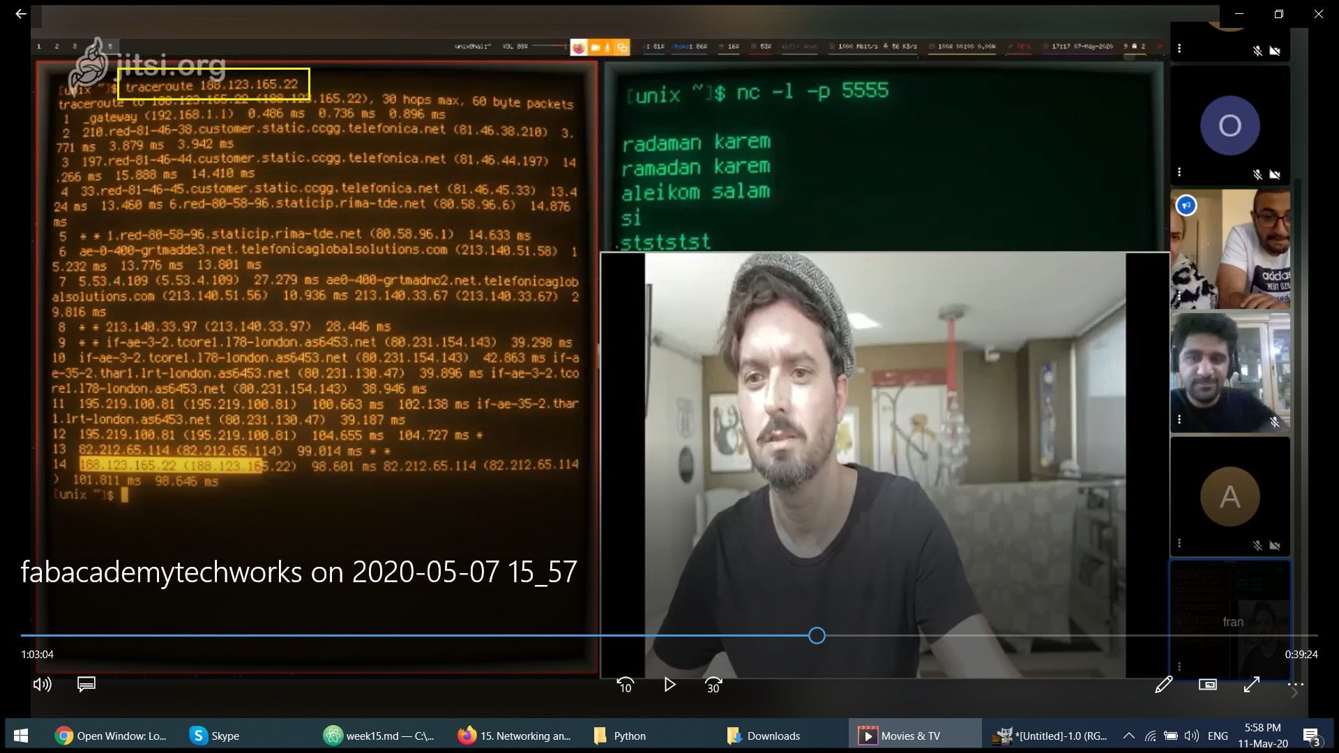 We complete the group assignment in a group call. Using Netcat (nc) under linux, we connected two PCs in two different locations, Frank in Spain with Faisal in Jordan. This is a simple and basic way to create communication beween two PCs to send and receive raw data. Frank used linux, and Faisal used Windows Subsystem for Linux.