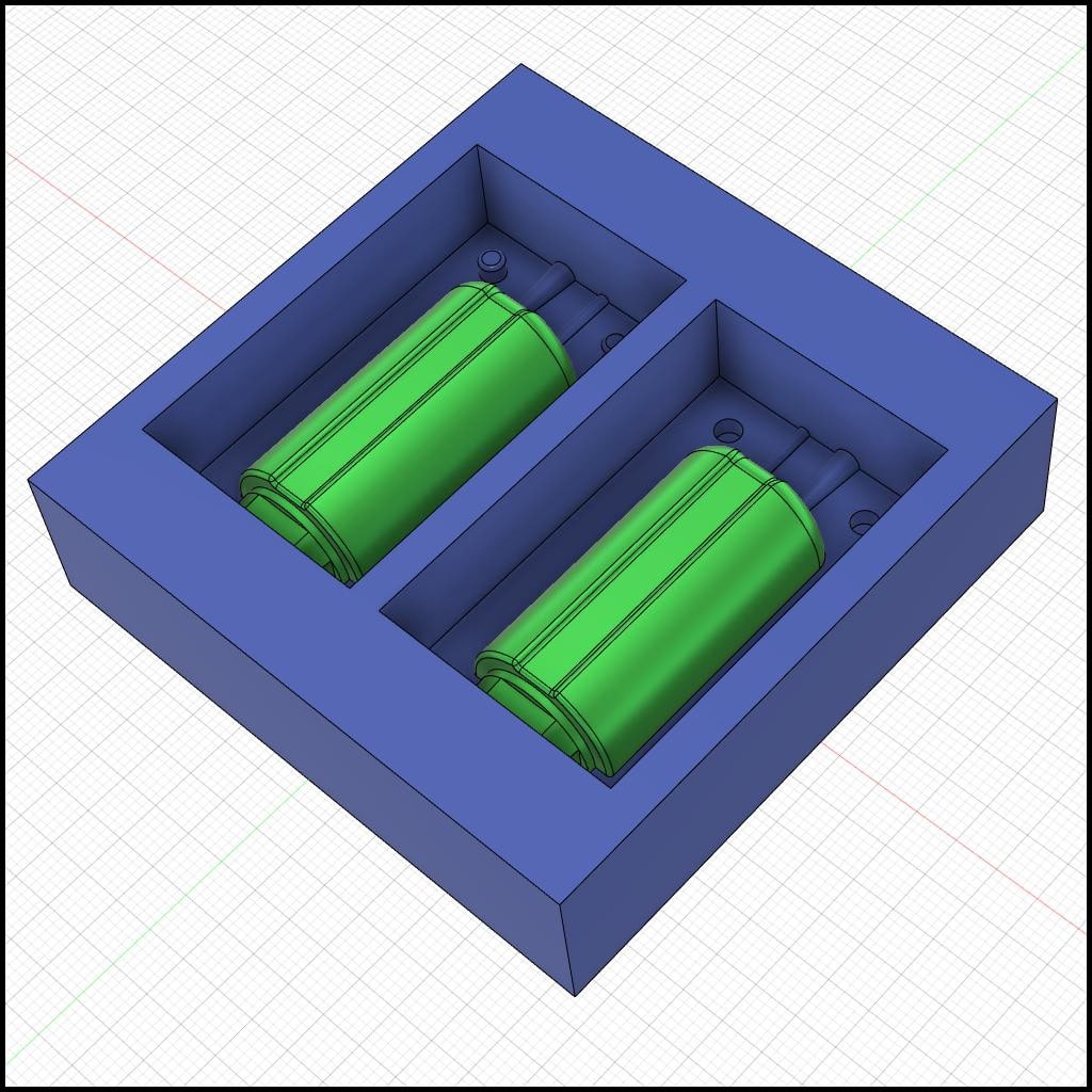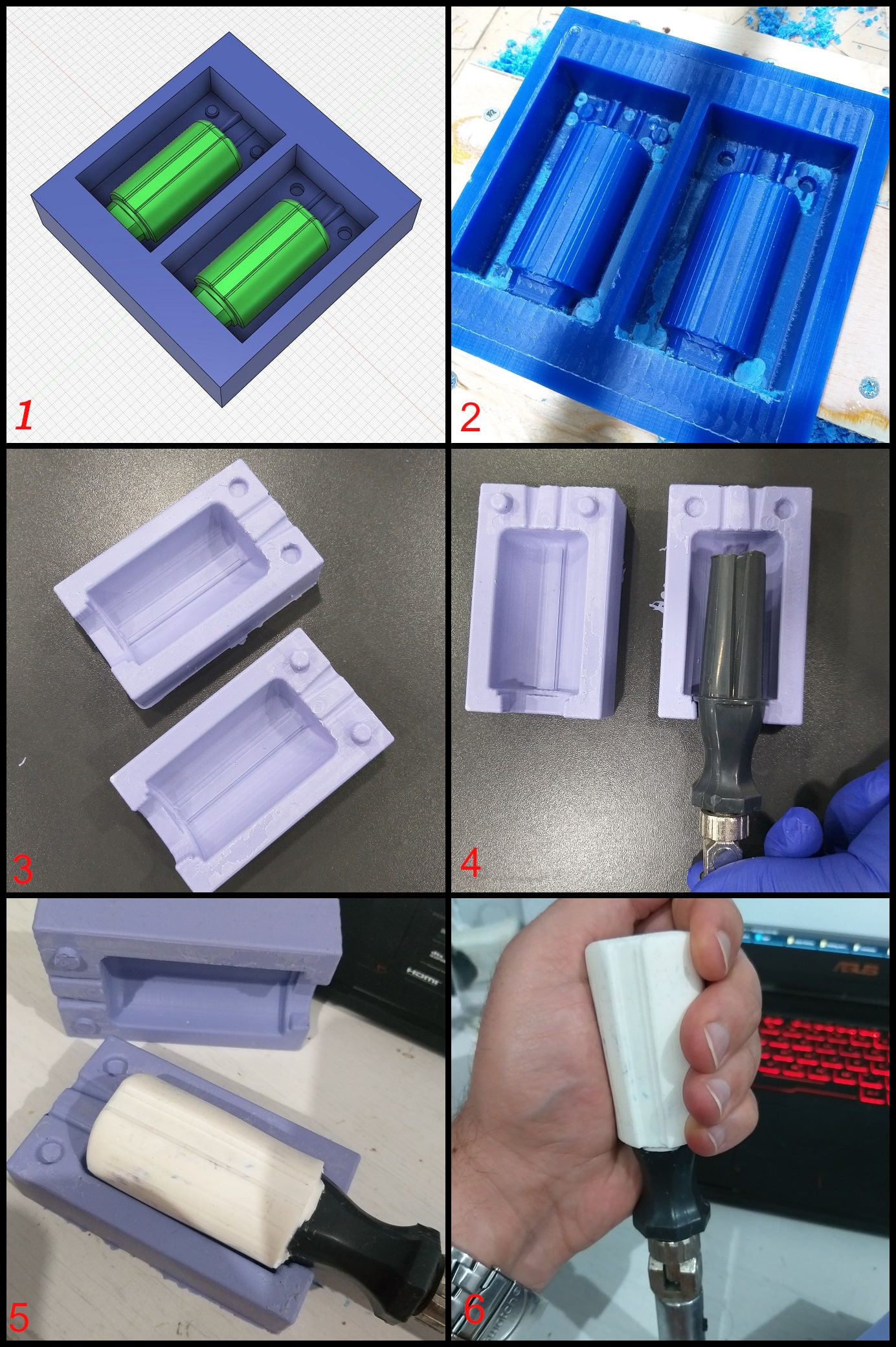 I created a model for the new grip, including the edge and part of the original body below the edge (shown in red). This will not be molded in the final product, it will be used to register the mold parts in the right position. This part fits to the size in the handle. So, the handle part corresponding to the red part will fit in the cavity created by the silicone negative mold, and the final product (using liquid plastic) will fill the cavity to create the green part.