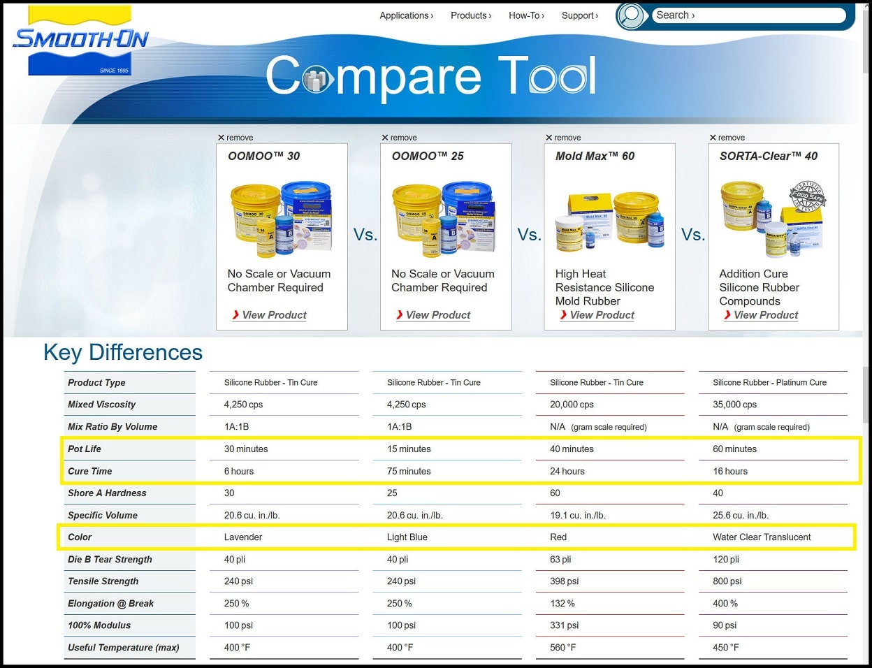 The image lists the key differences between the 4 liquid rubber materials. For example, there are operational differences like pot life and cure time, and there are finish differences like end product color.