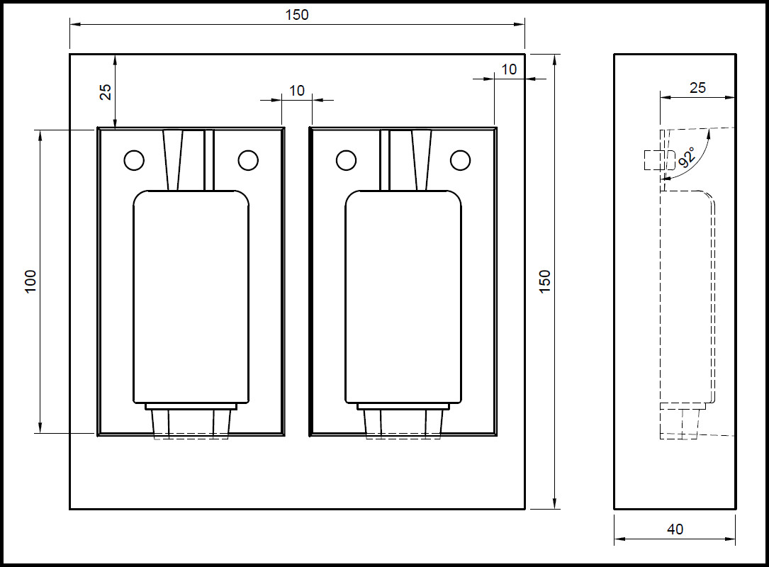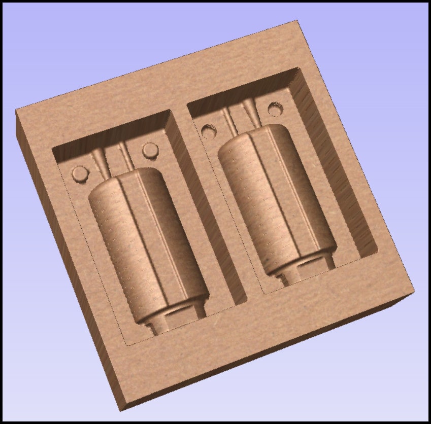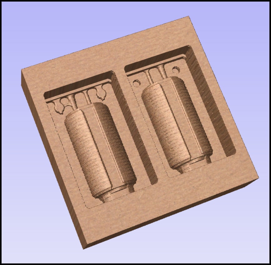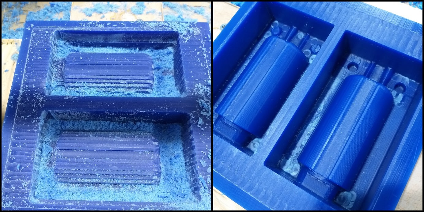 For machinable wax, I will use 150 mm x 150 mm x 40 mm block. After modeling the grip, I made it into two halves and put on the block. Then I created two registration pins and two grooves. The conic one will be used to pour liquid plastic and the straight one will provide a path out for air trapped in mold cavity.