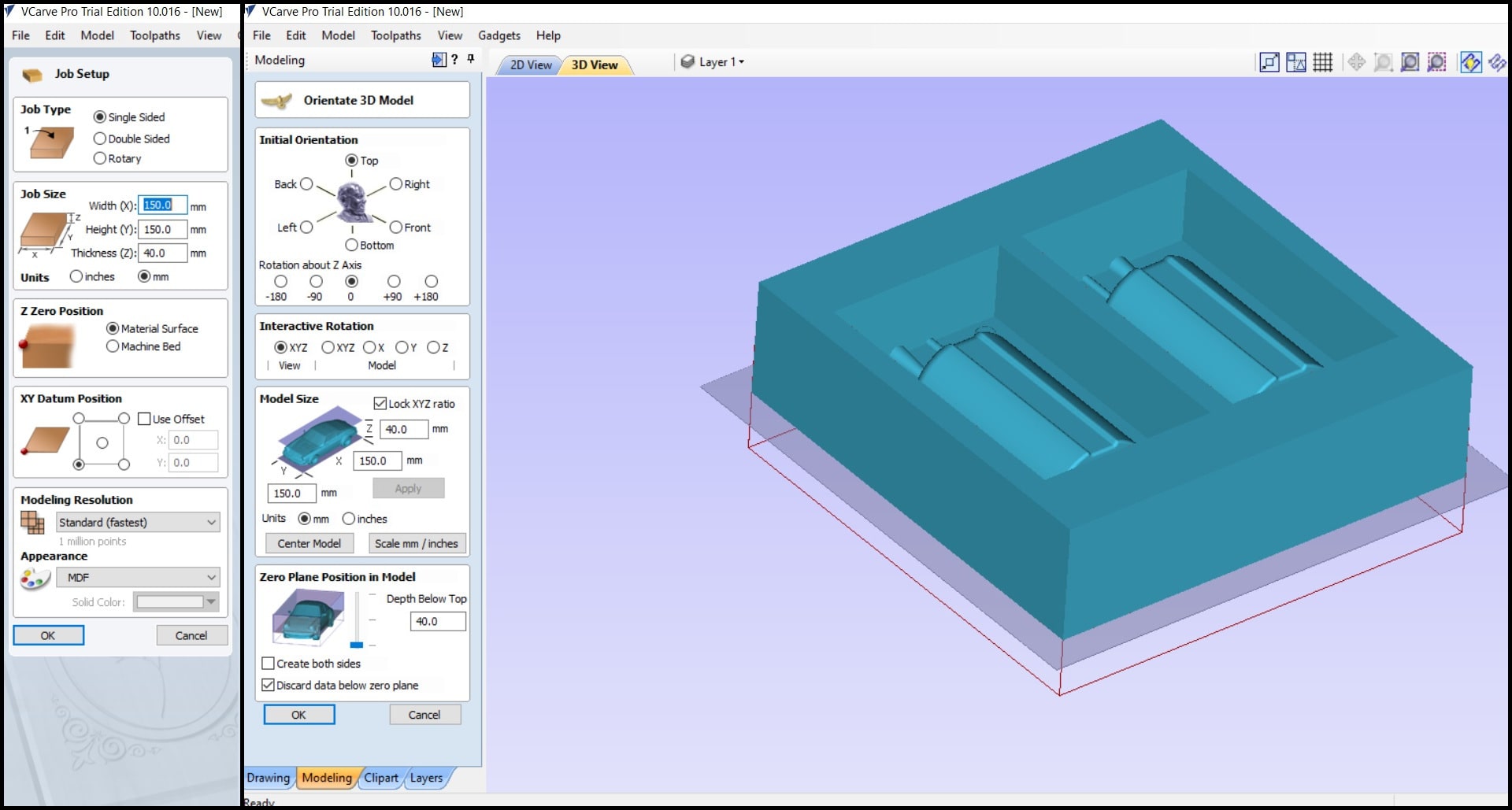 Step 1: Open VCarve and create a new file. In job setup, insert your machinable wax block size. Click “File > Import > Import Component/3D Model” and import your 3D STL file.