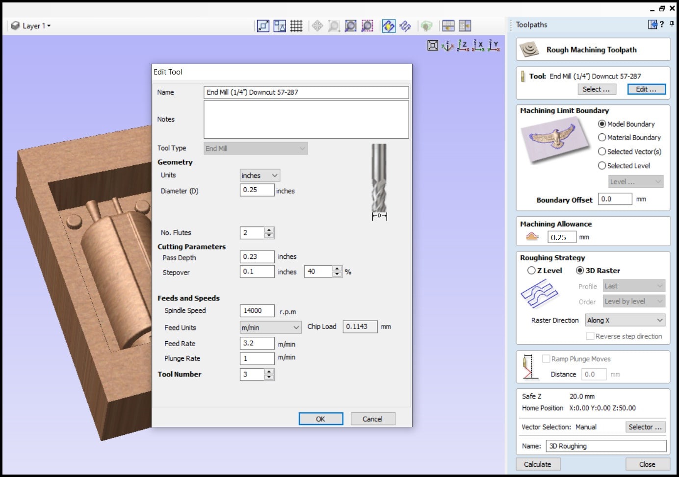 Step 3: Select the tool for 3D roughing, in my case 1/4” endmill. Click “Calculate”