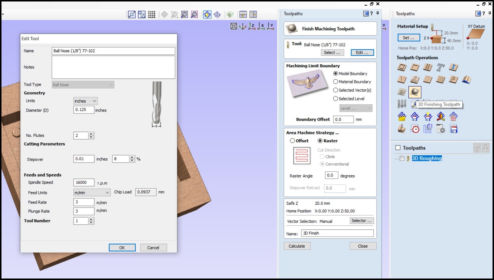 Step 4: Click on “3D Finishing Toolpath” and select the tool for 3D finishing, in my case 1/8” ball nose. Edit the endmill and change the step over to a small value (I used 8%). Note that the 3D finishing toolpath is a single pass.