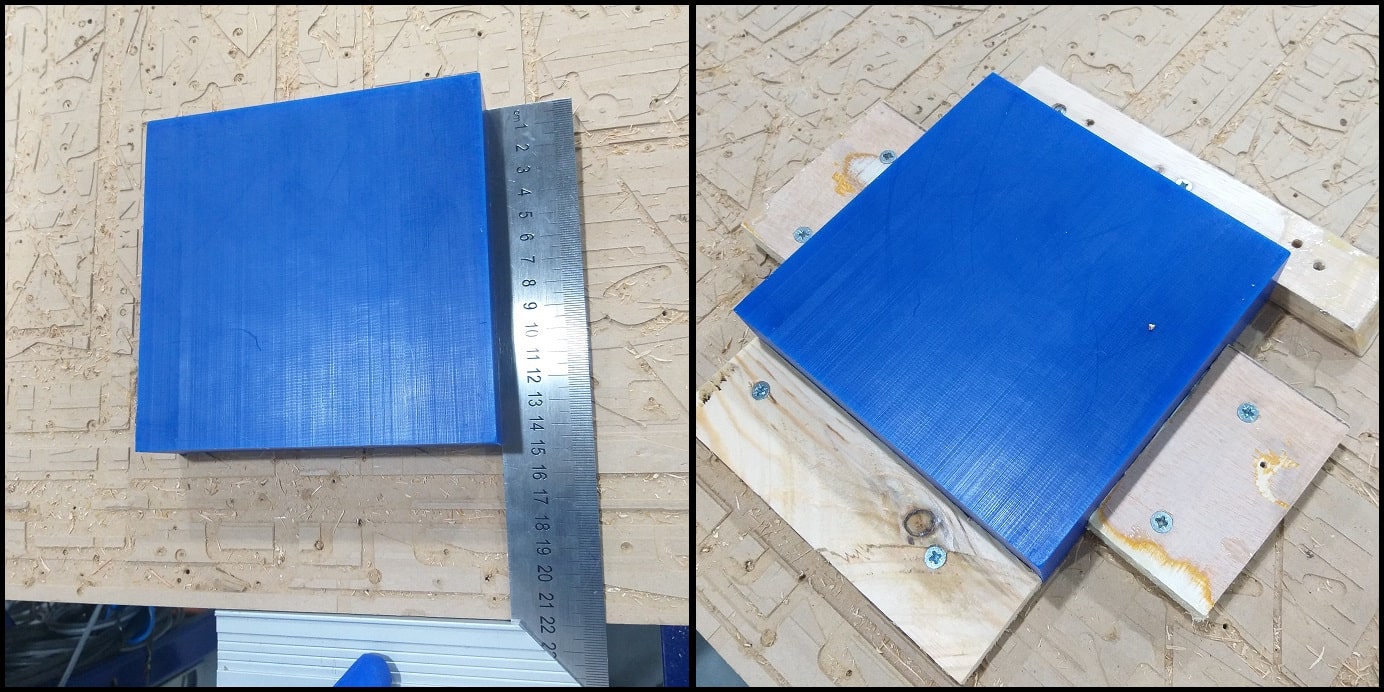 For my mold, I used machinable wax stock (150 mm x 150 mm x 40 mm). We fixed the block to ShopBot table using wood pieces and wood screws.