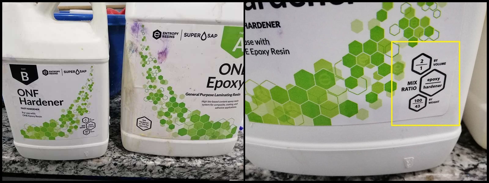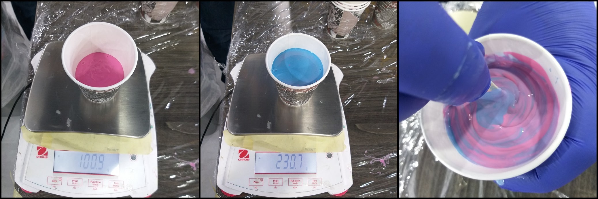 According to technical datasheet, mix ratio in 100A:130B by weight (or 1A:1B by volume). The first round I mixed 100 gm of material A with 130 gm of material B and mixed for a few minutes until mixture had a uniform color.