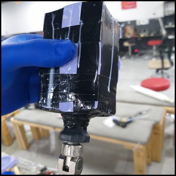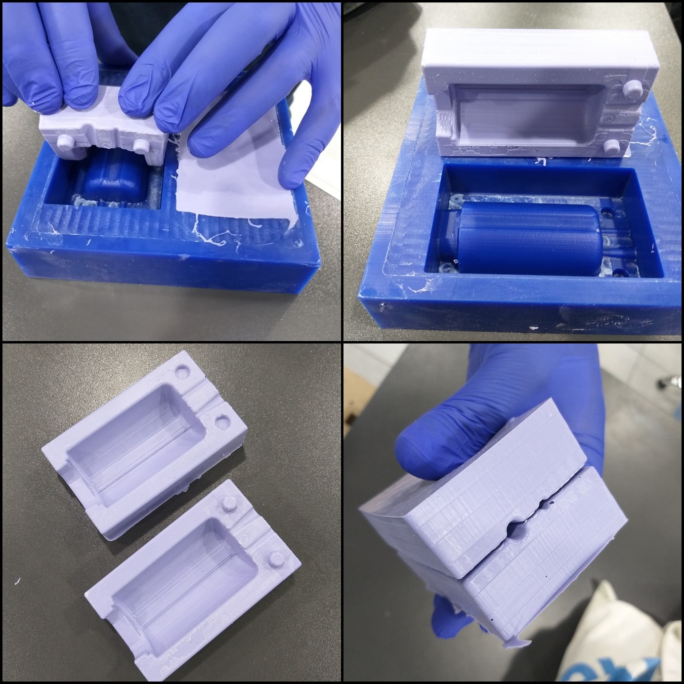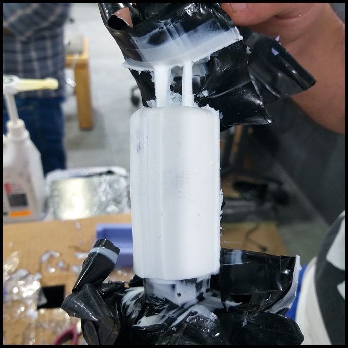 To reduce trapped air bubbles inside, I knocked the mold against table surface. This really worked as air bubbles were rising to the surface. The OOMOO™ 30 silicone rubber cure time is 6 hours. I left it at the lab for the next day.