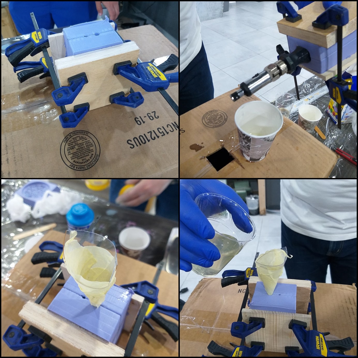 The first try I fixed the silicone rubber mold using two wood pieces and clamps. Then I made a funnel using a plastic sheet to pour the liquid plastic mix into the mold. There was a leakage from the bottom where the handle fits to the silicone mold.