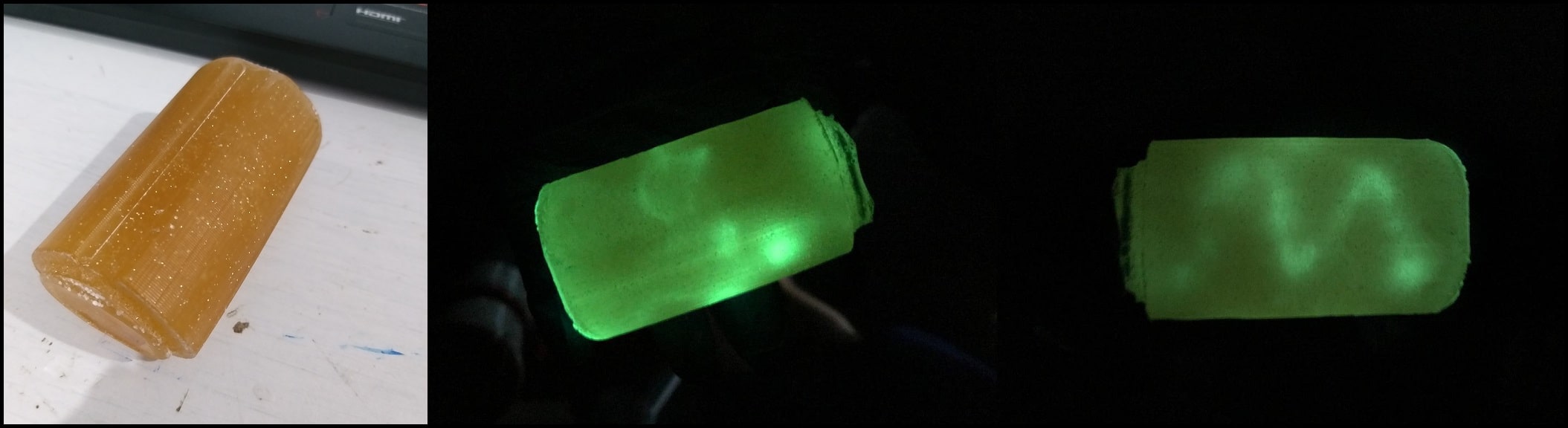 I mixed to the resin glow in dark powder and glitter powder. The block can be charged by light.