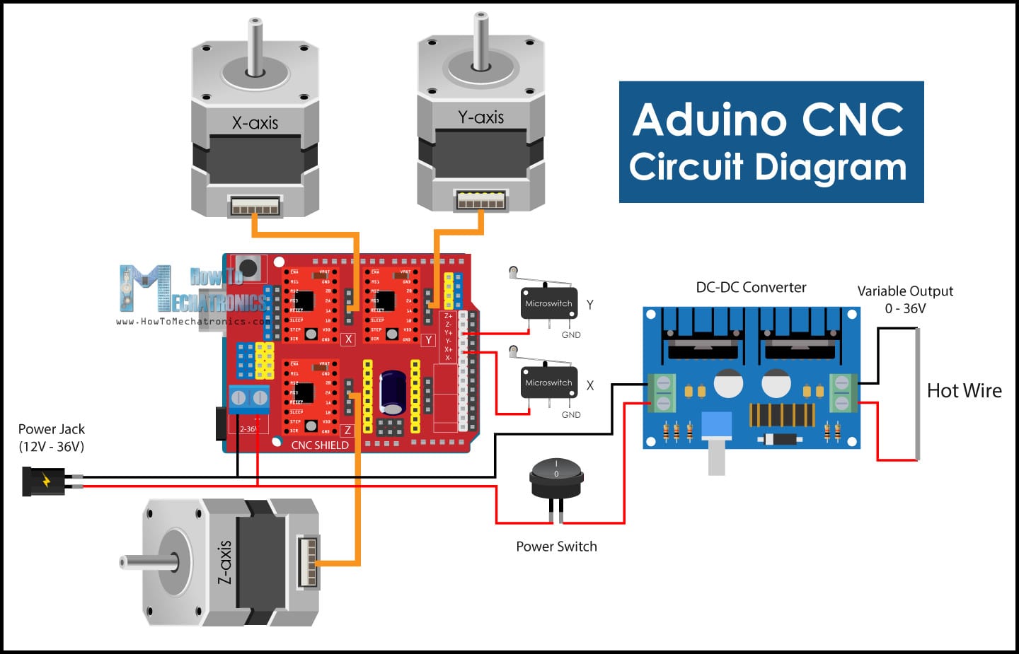 The image below shows how different components are connected to each other. Note how all components are interfaced to Arduino board using the CNC shield. This will make connected compact and easier to complete.