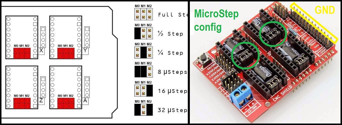 The CNC shield has connections to resolution selectors and jumpers can be used to set the required resolution. A connected jumper will drive the selector pin (M0, M1, M2) to level high. The image below shows some examples for driver resolution for DRV8825. In our machine will use 1/16 stepper resolution.