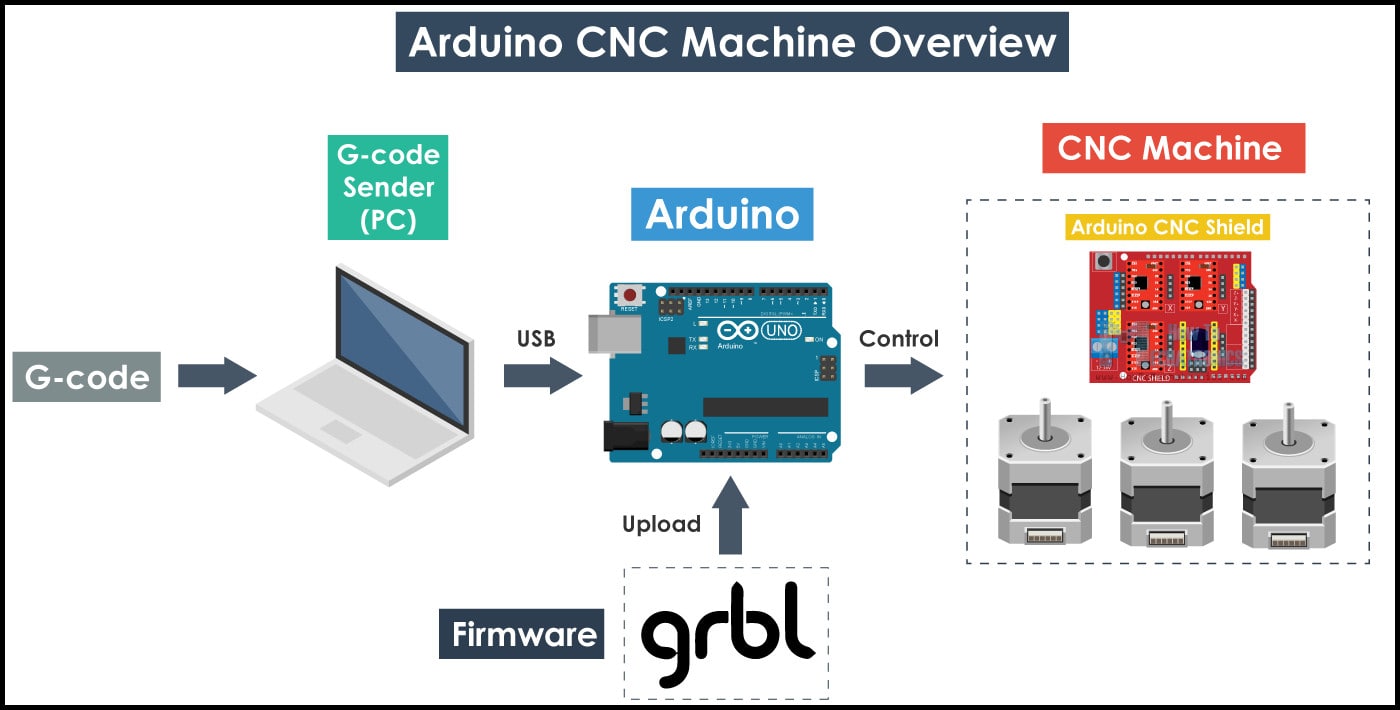 GRBL is a firmware for Arduino board running on ATmega328P microprocessor. GRBL accepts g-code as inputs and generates outputs at Arduino board pins. Compared to industrial CNC machines, when GRBL is used there is no need for any ports to control the machine, only the USB port connected to Arduino board. In other words, when GRBL firmware is installed to Arduino board, it will read g-codes and control the machine accordingly. To know more about GRBL, check the project page.
