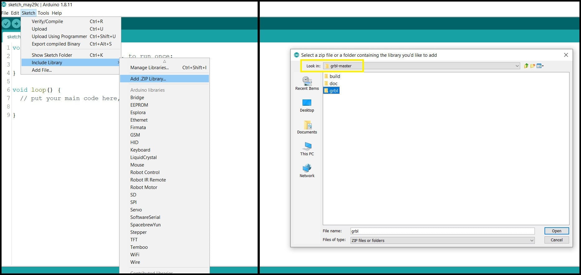 Step 2: In Arduino IDE go to “Sketch > Include Library > Add .ZIP Library…” and from inside “grbl-master” folder locate “grbl” folder. Click open.