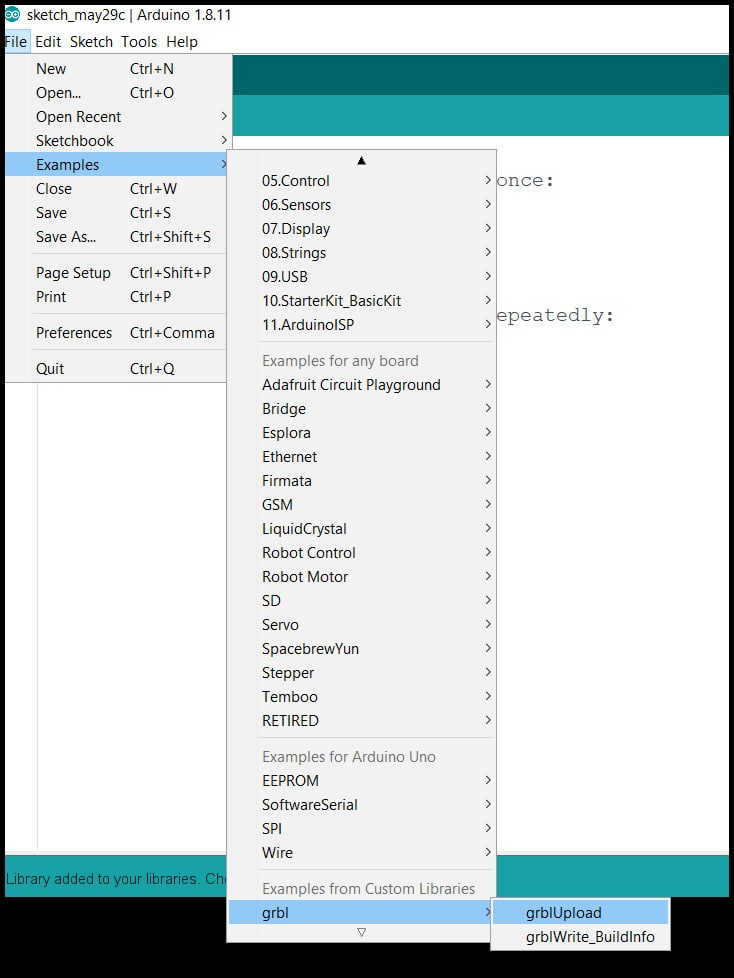 Step 3: Go to “File > Examples > grbl > grblUpload”, select the Arduino board (UNO in our case) and the COM port, click upload.