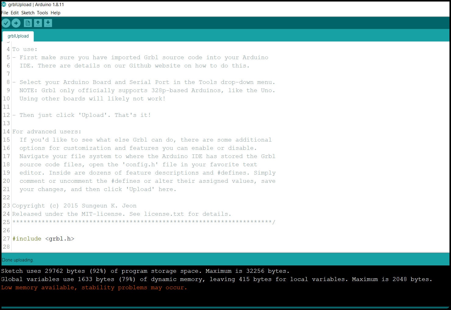 Save the file and reupload the “grblUpload” sketch to our Arduino board.