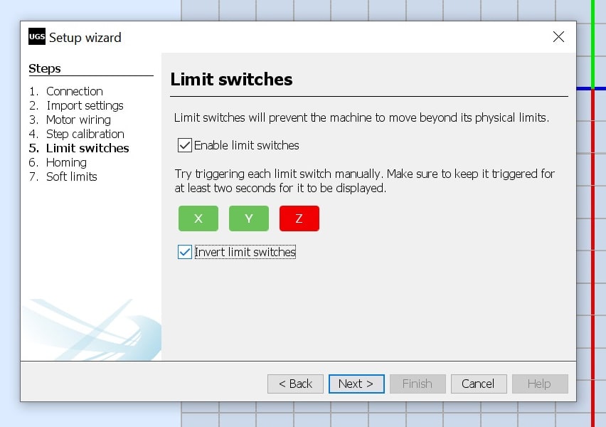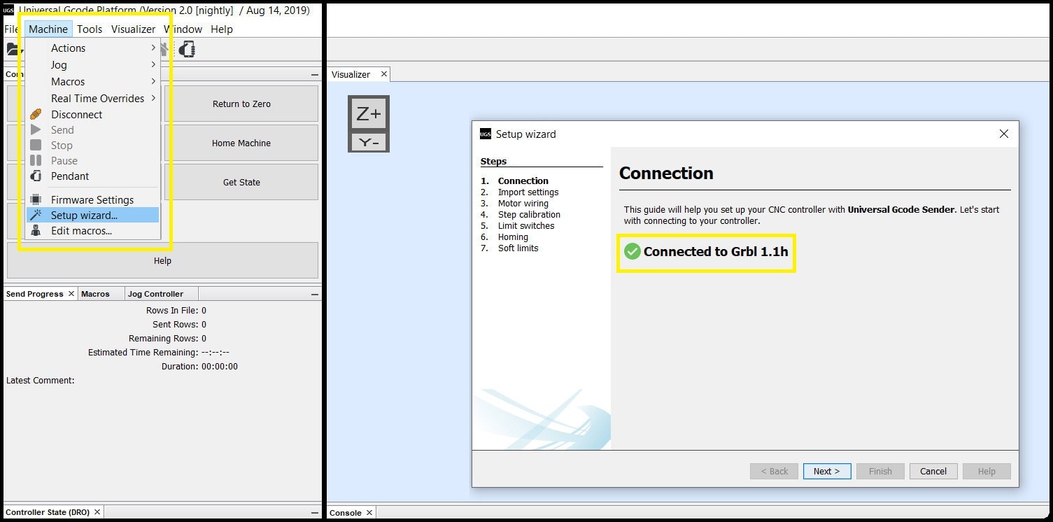 Step 4: To configure the machine, we will use the built in setup wizard. Go to “Machine > Setup wizard…”. A new window will appear, which will confirm connection to GRBL.