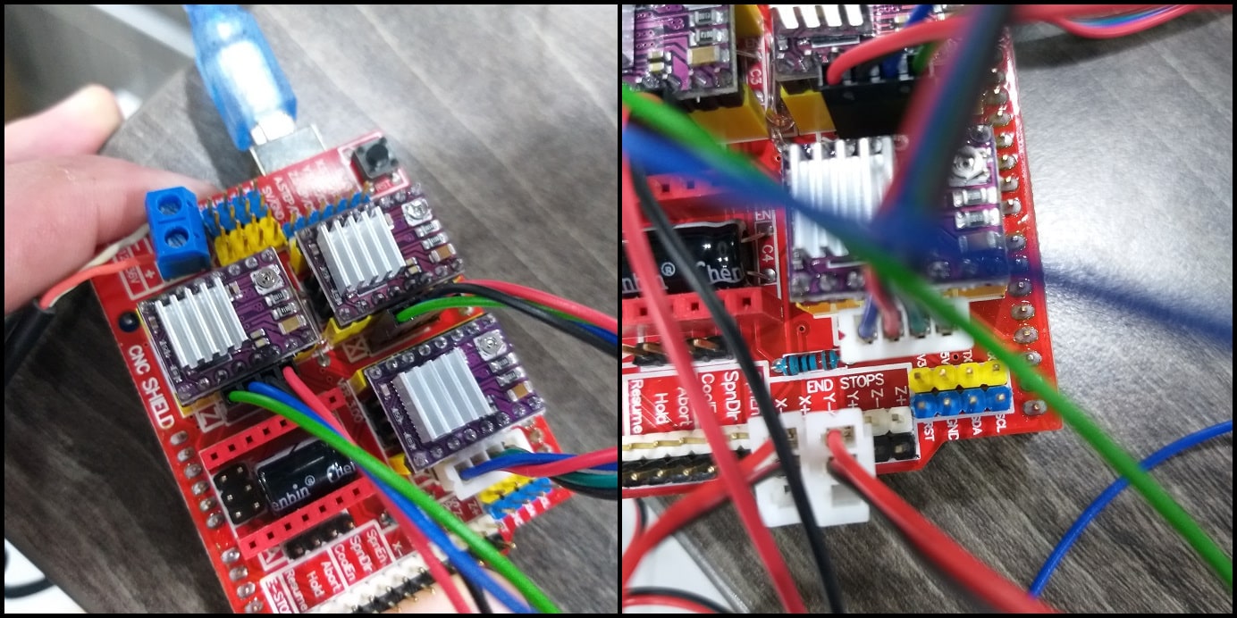 Then we connected stepper motors, limit switches for +X and +Y axes, powered the shield with +12 VDC and connected Arduino USB cable.