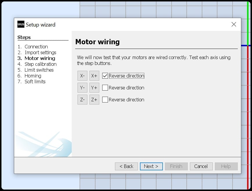 To test steppers and limit switches, we used the g-code sender. We ran the setup wizard and connected to GRBL in Arduino. In “Motor wiring”, we tested the operation for each stepper and tried to reverse direction.