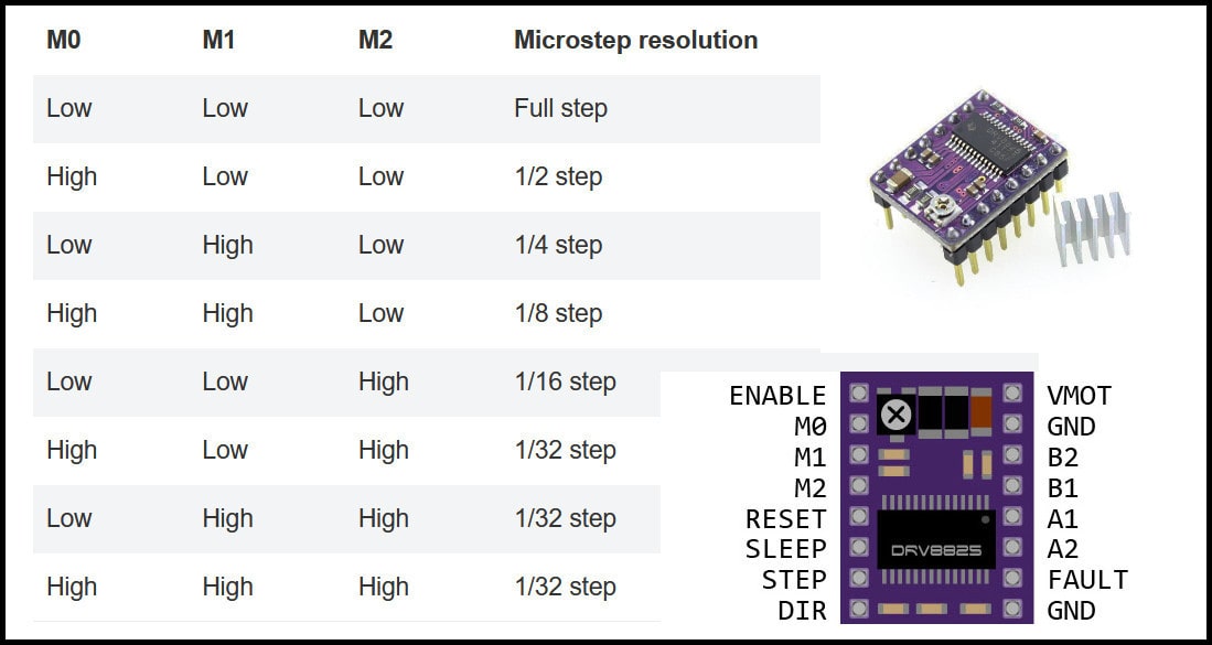 The DRV8825 driver can be set to drive stepper motors at different resolutions. The driver resolution selectors have 100 kOhm pull-down resistors, which makes them level LOW if there are left unconnected.