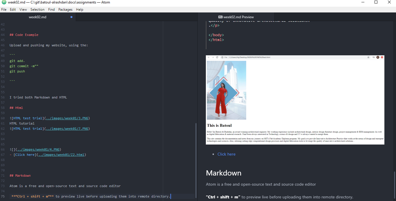 Step 5: Using cd batoul-alrashdan/, now I am working inside the cloned directory “batoul-alrashdan”. Step 6: I made some changes inside the directory, modified images and edited “about me” and “student agreement” parts using Atom. I checked changes I made using the command git status.
