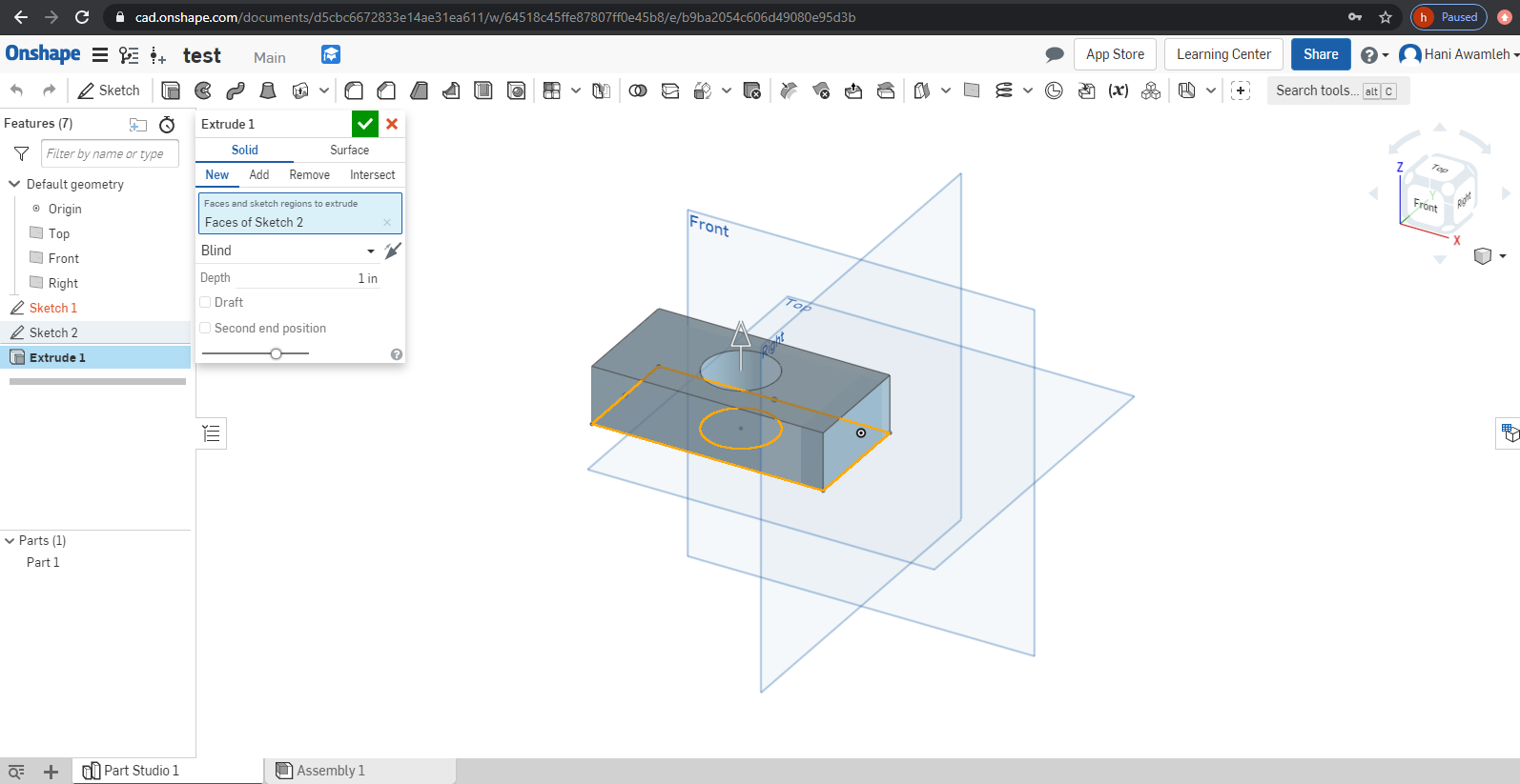 first of all i have tested this software by designing something simple so to that i have drawn a 2D sketch which is a rectangle and then a circle “to make it as a hole later ” then, i extruded the 2D sketch to make it 3D object “i did not extrude the circle” and i ended up with this shape :