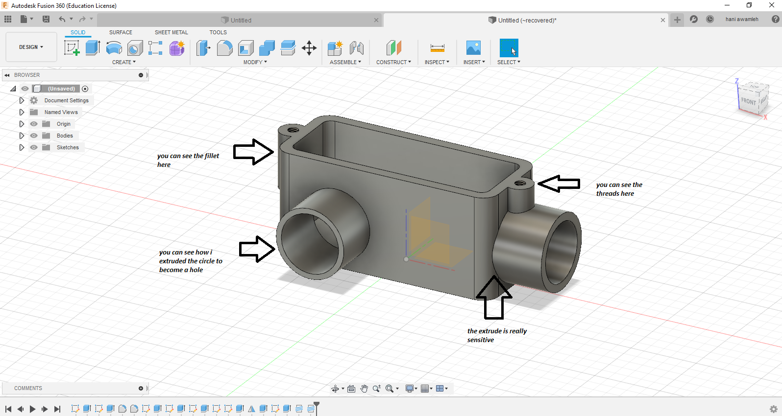 As i said i statred with a 2D sketch then i extruded that sketch to become a 3D object then i added a circle and extruded that circle to become a cylinder after that i have drawn another circle inside the cylinder and extruded it to become a hole then i did the same thing on the right side after that faced a problem with sides they were so sharp so i had to Fillet the edges then i added one circle on the top left of the object and extruded that circle to become a cylinder then i added a smaller circle to become a hole for a screw and i mirrored that on the other side and finally added some threads for the screw.