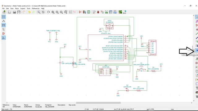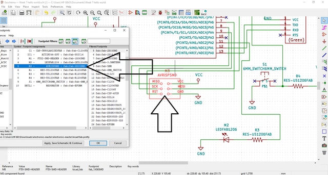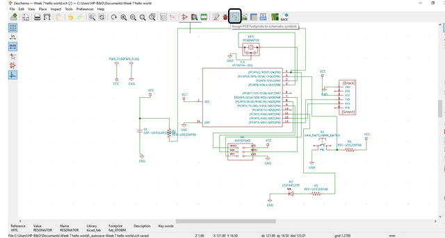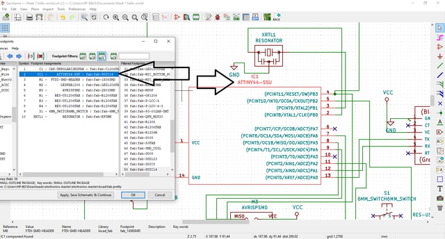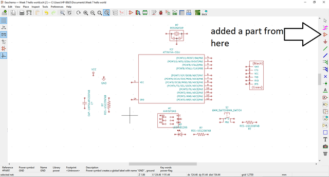 • Here i have added all the components i need in order to make the “Hello World” baord with addition to the LED and the button :